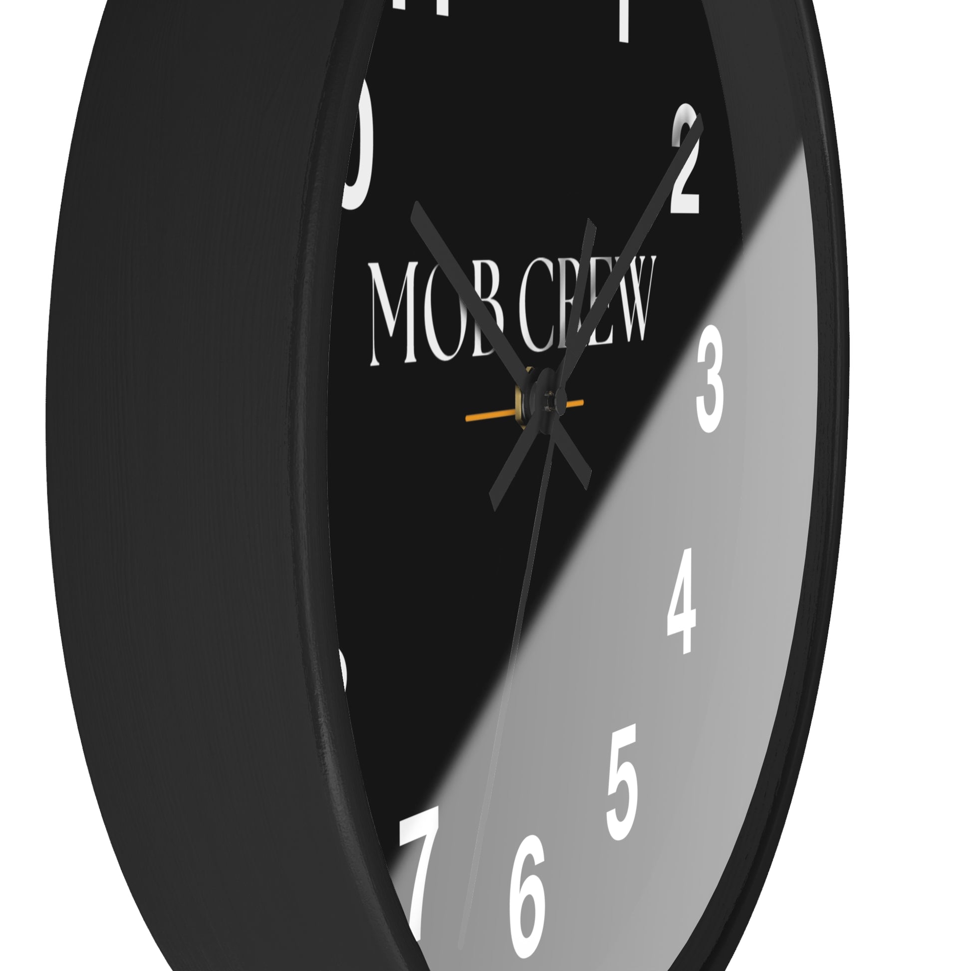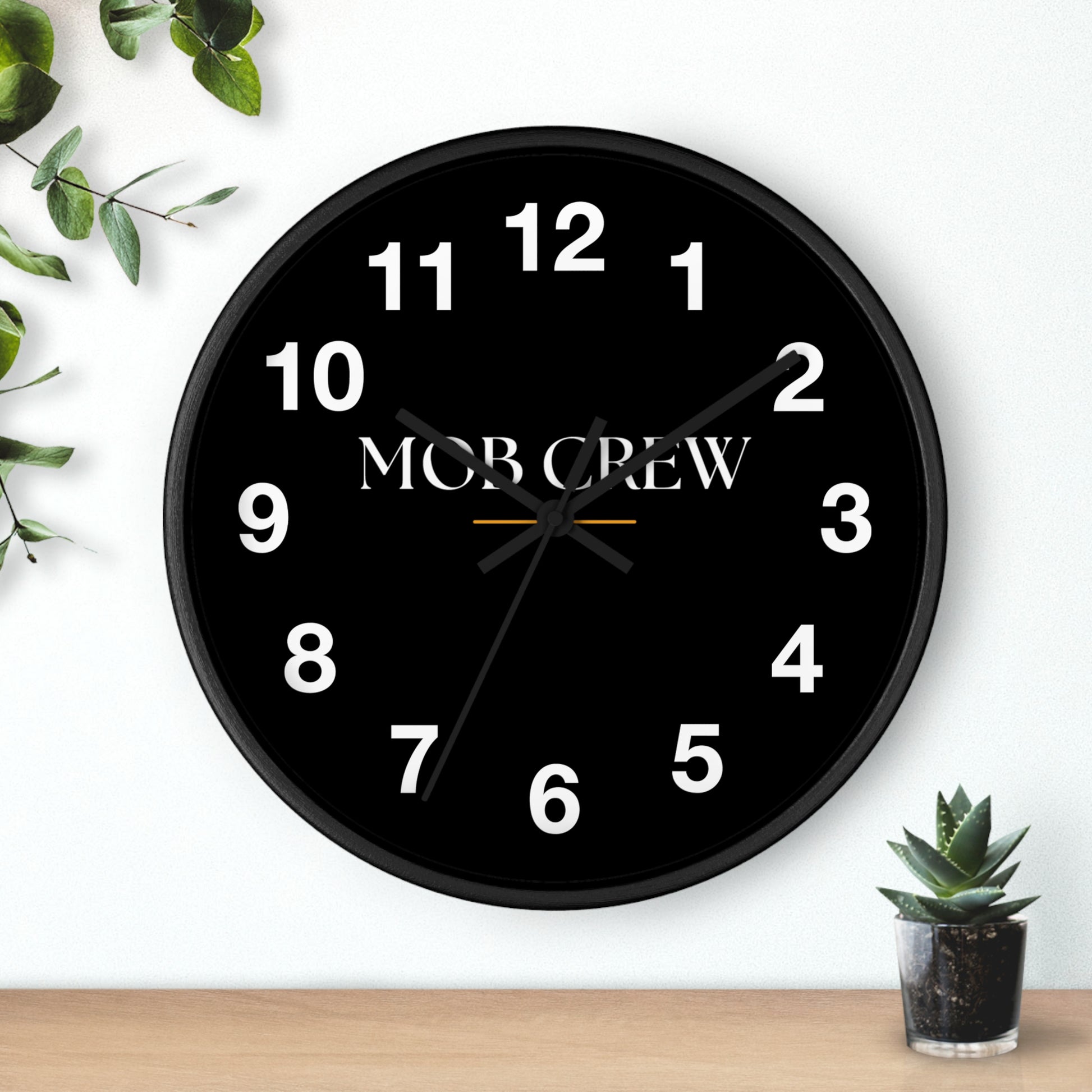 Bold, minimal, and built for focus. The Mob Crew Black Wall Clock brings quiet confidence to any room with a matte black face, crisp white numerals, and a clean centered wordmark. A subtle gold accent adds just enough character to keep it from feeling sterile—modern, restrained, and a touch upscale.